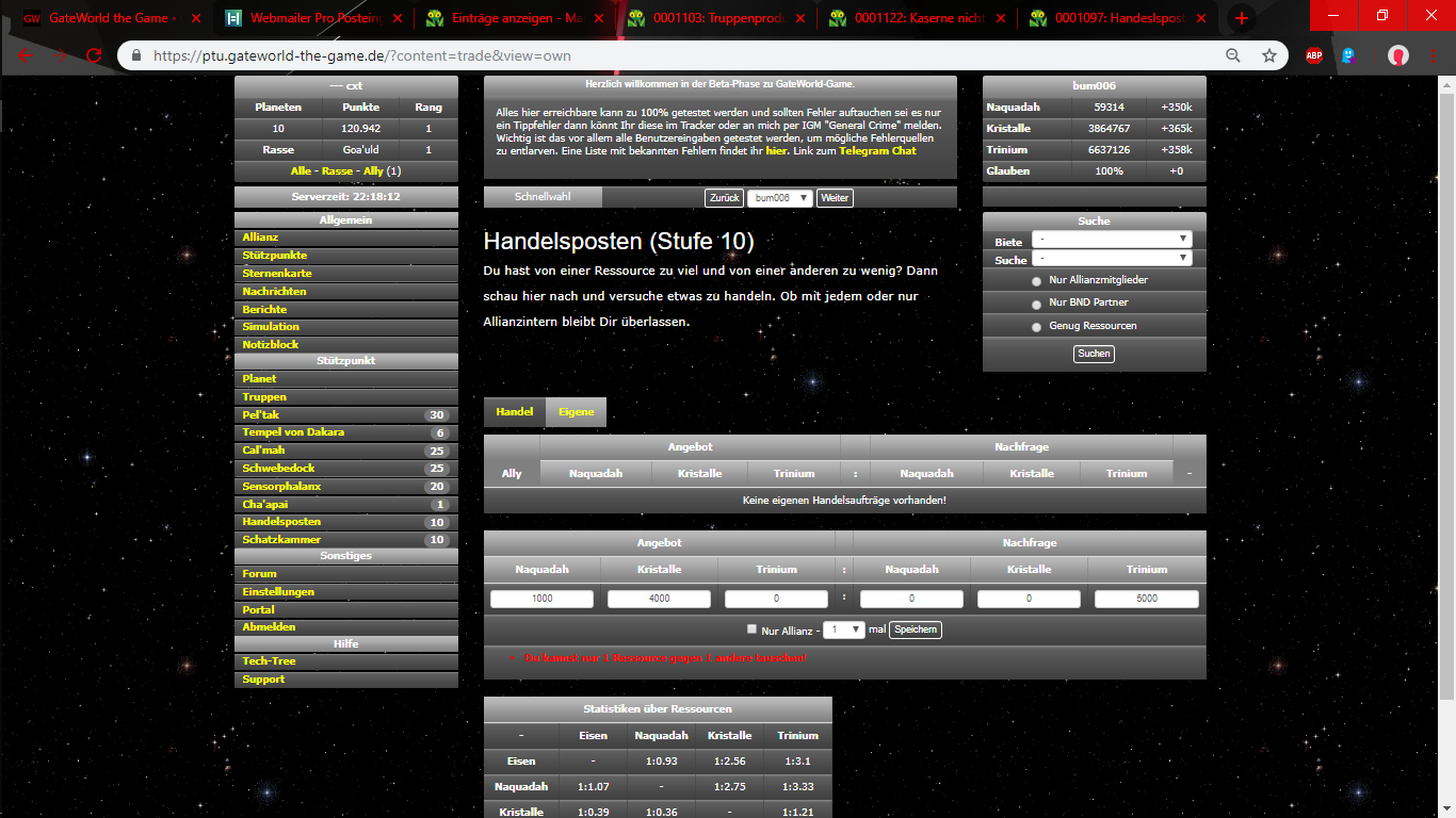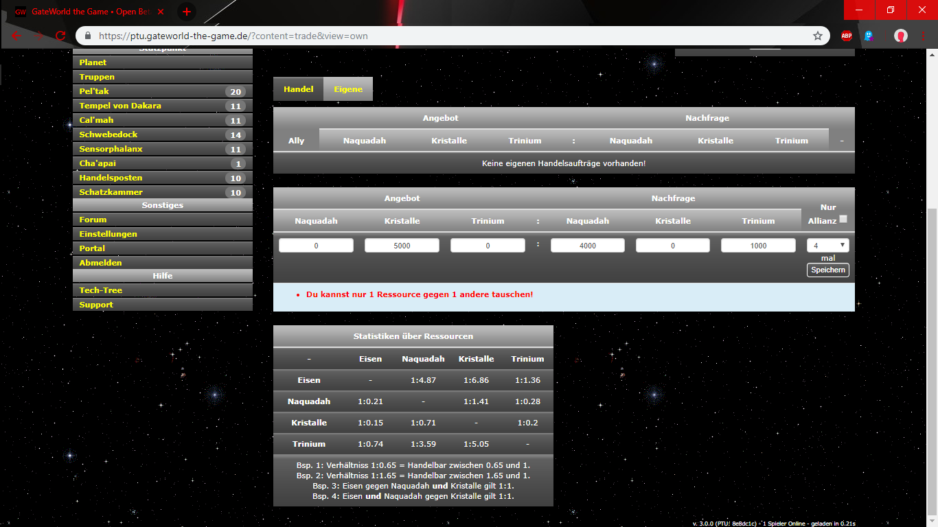 | Description | laut Handelsposten ist es möglich z.b. 5k Kristall gegen 4k Naq UND 1k Trinium zu tauschen. leider taucht dort dann ein Fehler auf. | ||||