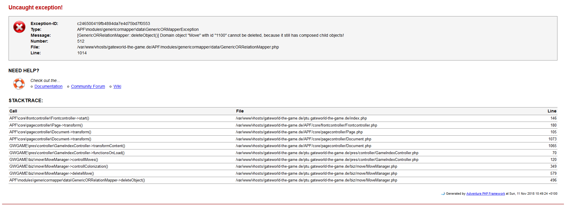 | Additional Information | [2018-11-01 19:04:12] [ERROR] [***] [GenericORRelationMapper::deleteObject()] Domain object "Move" with id "***" cannot be deleted, because it still has composed child objects! (Number: 512, File: /var/www/vhosts/gateworld-the-game.de/APF/modules/genericormapper/data/GenericORRelationMapper.php, Line: 1014) | ||||