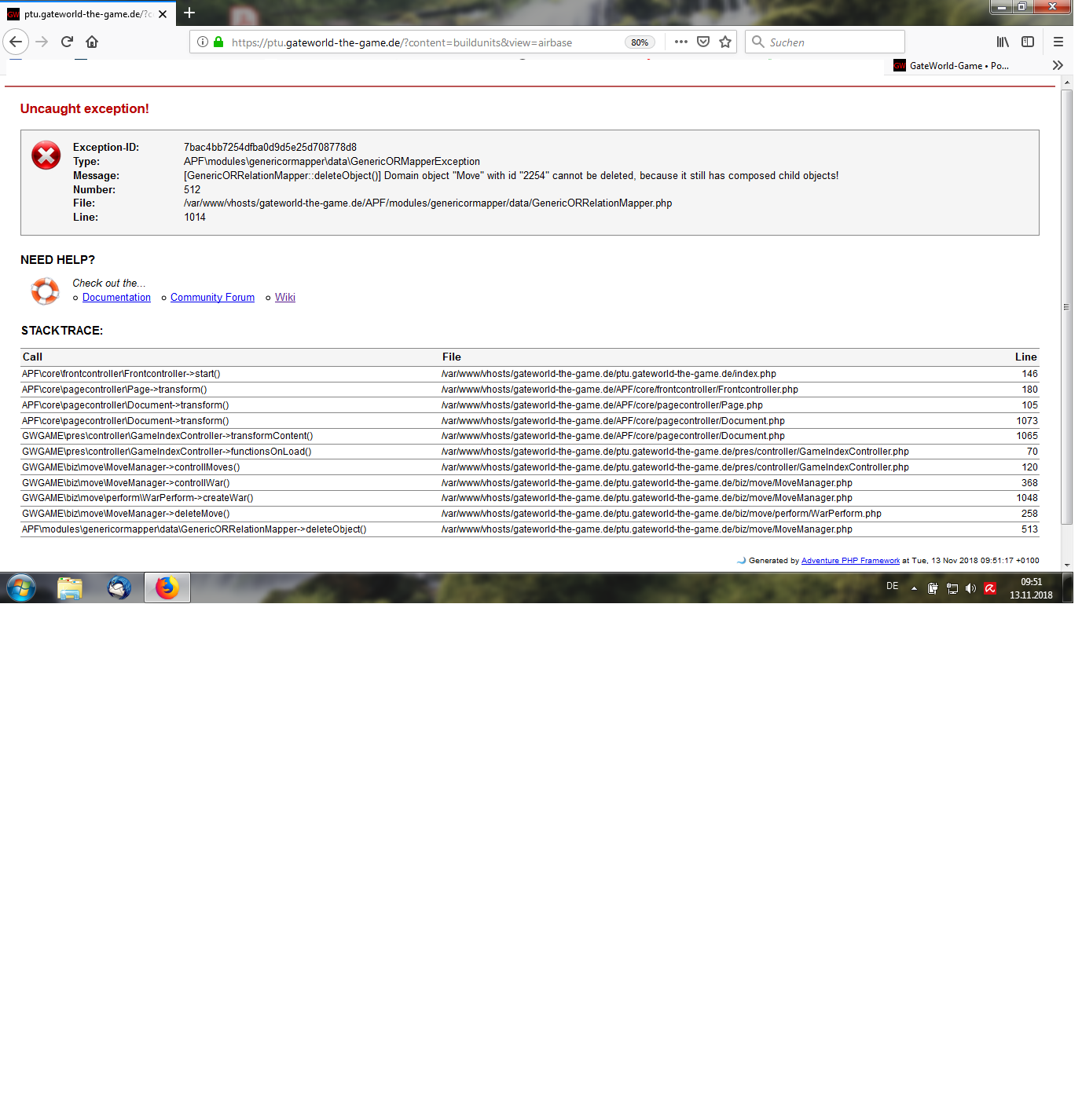 Nach der Erweiterung des Fehlerprotokols ist ersichtlich das angeblich noch Einheiten im Befehl existieren. Diese werden jedoch im Script richtig gelöscht vor dem löschen des Befehls. Wenn man die IDs der Befehle beobachtet werden nur wenige der Befehle fehlerhaft. Der Befehl wurde bisher jedoch immer im Gate erstellt, eine kleine Überarbeitung dessen ergab keine Besserung. Der Letzte Gedanke war das es 2 Einträge in der CMP Tabelle gab für 1 Einheit, dies wurde nicht bestätigt und ruft einen anderen Fehler auf. 2 Ideen sind noch gekommen: 1. gleichzeitig aufgerufenes Script da die Befehle von den Usern gestartet werden pro Klick. 2. CMP Eintrag für eine nicht existierende Einheit im Befehl. [2018-11-14 21:31:35] [ERROR] [ec55c64d76d07d63cb41e24bed3deed6] [GenericORRelationMapper::deleteObject()] Domain object "Move" with id "3782" cannot be deleted, because it still has composed child objects!Child Table is "cmp_move2moveunit" (Number: 512, File: /var/www/vhosts/gateworld-the-game.de/APF/modules/genericormapper/data/GenericORRelationMapper.php, Line: 1014) |