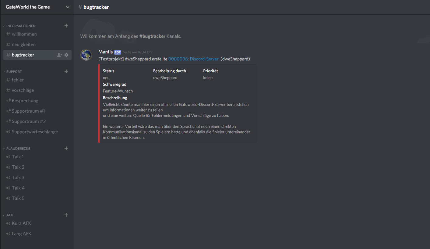 | Description | Vielleicht könnte man hier einen offiziellen Gateworld-Discord-Server bereitstellen um Informationen weiter zu teilen und eine weitere Quelle für Fehlermeldungen und Vorschläge zu haben. Ein weiterer Vorteil wäre das man über den Sprachchat noch einen direkten Kommunikationskanal zu den Spielern hätte und ebenfalls die Spieler untereinander in öffentlichen Räumen. | ||||