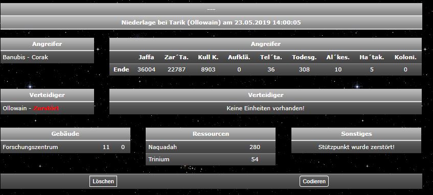| Description | Zitat: Hey meine Flotte ist teilweise weg, sie war auf dem Weg von einem Palneten (wurde zerstört) zu meinem Startplaneten. Es waren um die 10k Käfer, 5k Spinnen, 180 Jäger und 7 Kreuzer...vielleicht gibt es die Möglichkeit, dass du sie wieder findest. Viele Grüße Ollo | ||||