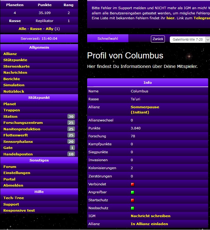 Die Spieler waren in der anzeige vertauscht. So dachte das System der aktuelle Spieler sei das Ziel. Dies habe ich korregiert. Zudem wird nun bedacht das Spieler die Siegpunkte besitzen keinen Noobschutz mehr haben können und dies auch richtig dargestellt. Columbus kann somit weiterhin Reese angreifen (anzeige udn funktion waren richtig) Columbus sihet bei Reese aber nicht mehr das er im Noobschutz ist (anzeige zeigte ebenso das falsche an) |