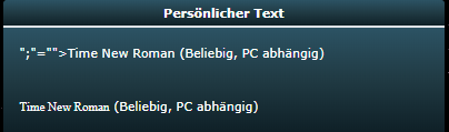 | Description | Verwendung laut Übersicht: [face="Times New Roman"]Time New Roman[/face] (Beliebig, PC abhängig) Korrekte Verwendung ist: [face=Times New Roman]Time New Roman[/face] (Beliebig, PC abhängig) | ||||